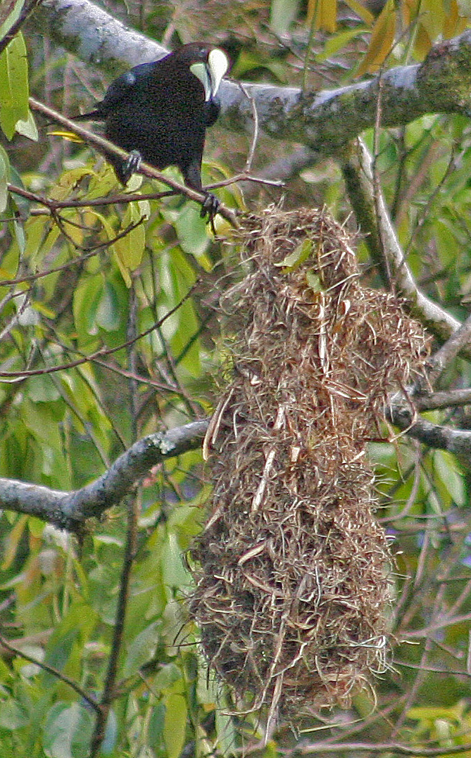 Fantastiskt roliga fåglar som "sjöng" regndroppspreludiet med inslag av pisksnärtar och annat. Lyssna så kan du få höra lite av det hela. Med sina långa hängande bon är de också mycket intressanta fåglar att titta på.